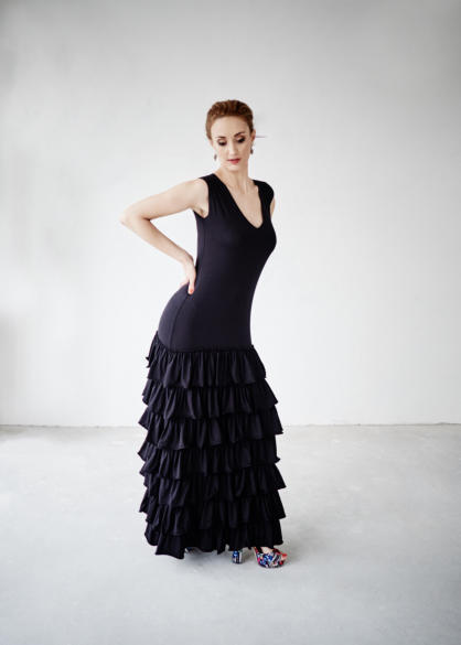 Rochie neagra,lunga,cu volane aplicate,decolteu in V,fara