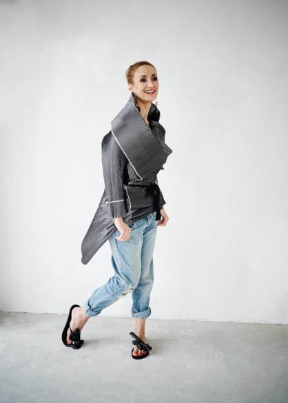 Sacou din matase plisata cu guler sal. Inchiderea se face