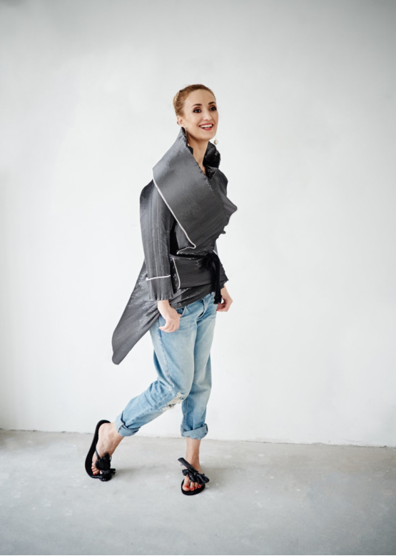 Sacou din matase plisata cu guler sal. Inchiderea se face