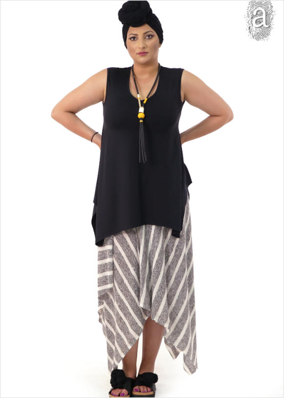 Fusta in dungi gri cu alb,asimetrica,elastic negru in talie.